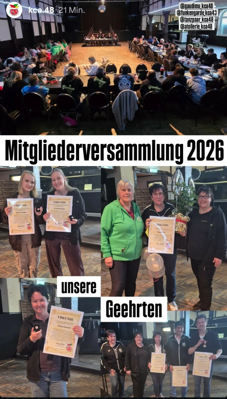 Im Anschluss folgte die Jahreshauptversammlung des Karnevalsvereins KCA 48 e.V.. Hier wurden unsere Mitglieder Peter, Doreen, Sarah und Yasmin für ihre langjährige, engagierte Vereinsarbeit ausgezeichnet. Wir sind stolz auf euch und danken euch für euren unermüdlichen Einsatz.